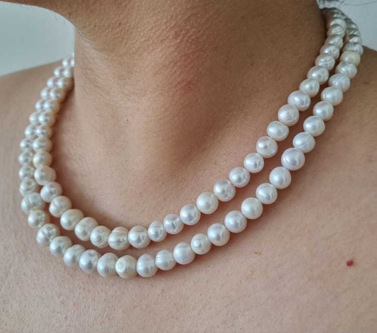 زیبایی کلاسیک در قالبی مدرن! این گردنبند دو رشتهای از مرواریدهای پرورشی با سایز مهره ۸ میلیمتر ساخته شده که با درخشش طبیعی خود، جلوهای چشمنواز و اصیل به استایل شما میبخشد.