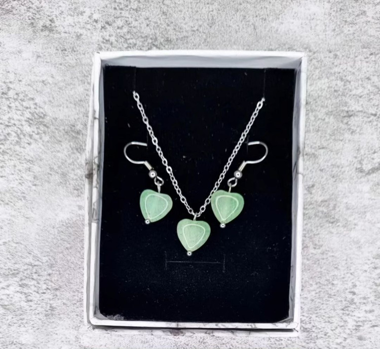 در این نیمست، یک گردنبند و یک جفت گوشواره طراحی شده که هر کدام با سنگی صیقلخورده از اونتورین سبز تزئین شدهاند؛ سنگی که از دیرباز به عنوان سمبل شانس، رشد فردی و آرامش ذهن شناخته میشود. قلبها با دقت بالا تراش خوردهاند تا نهتنها زیبایی چشمنواز داشته باشند، بلکه در لمس هم حس دلنشینی القا کنند 💎