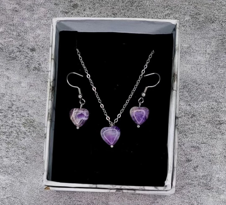 با نیمست آمیتیست، زیبایی و انرژی معنوی را همزمان تجربه کنید. این ست شامل یک گردنبند و یک جفت گوشواره است که هرکدام با سنگی از آمیتیست طبیعی به شکل قلب تزیین شدهاند؛ سنگی افسانهای با رنگ بنفش خاص و درخشان که از دیرباز نماد آرامش، تمرکز ذهنی و پاکسازی انرژیهای منفی بوده است.