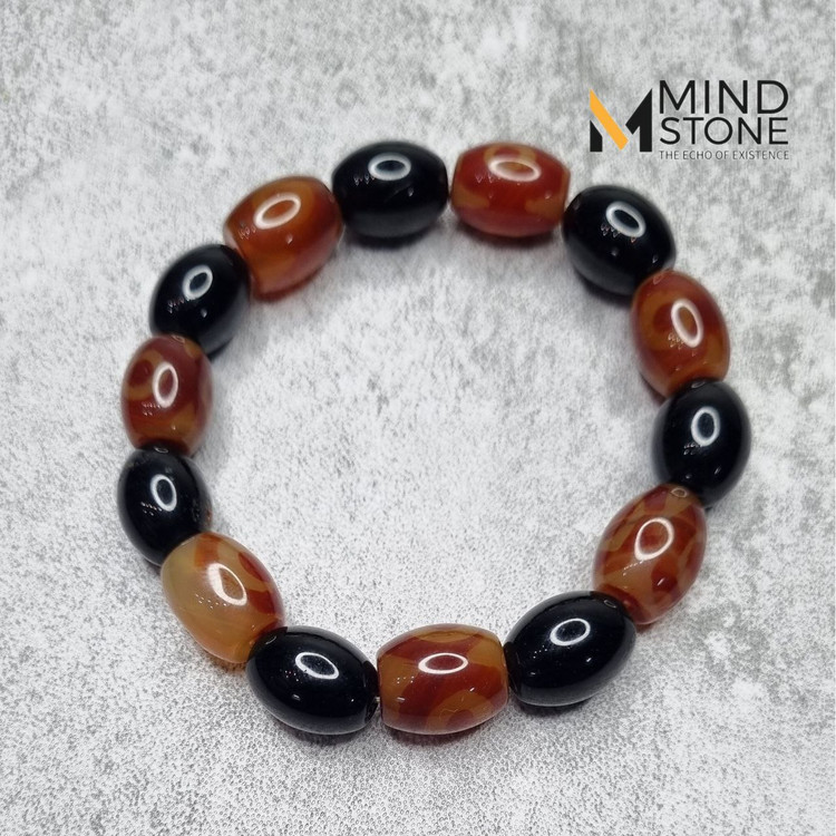 دستبند 14 میل عقیق سرخ و عقیق سیاه با طرح تبتی