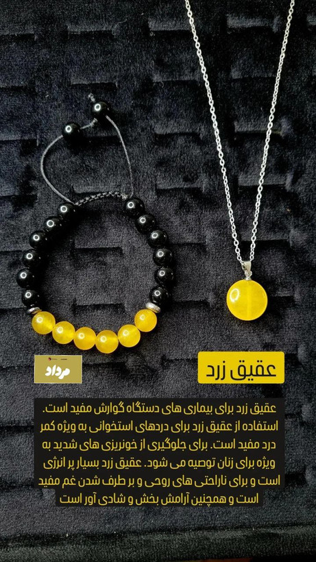 گردنبند سکهای با سنگ عقیق زرد و دستبندی متشکل از ۶ مهره عقیق زرد در مرکز، در کنار ۱۲ مهره اونیکس سیاه و دو منگوله آویزان، ترکیبی شاد و چشمنواز برای تولد خورشیدیترین ماه ساله ☀️