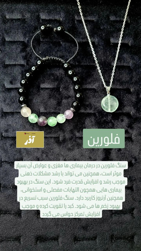 گردنبند سکهای با سنگ فلورین چندرنگ، در کنار دستبندی با ۶ مهره از همین سنگ در مرکز، ترکیبی آرام و رنگارنگ برای روح ماجراجوی آذرماهیهاست. اطراف این مهرهها با ۱۲ مهره اونیکس سیاه و دو منگوله آویزان از اونیکس تزئین شده که زیبایی و قدرت رو در کنار هم نشون میده.