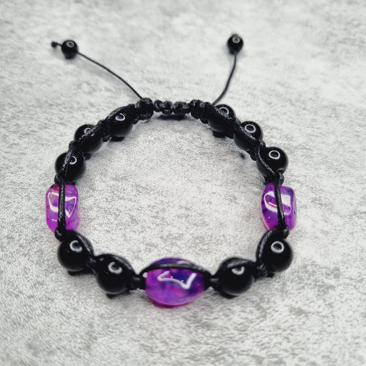 🔸 دستبند: بافت چرمی با گره آسانسوری، دارای ۳ مهره عقیق بنفش در مرکز و اونیکس براق در دو طرف – قابل تنظیم برای هر سایز مچ