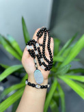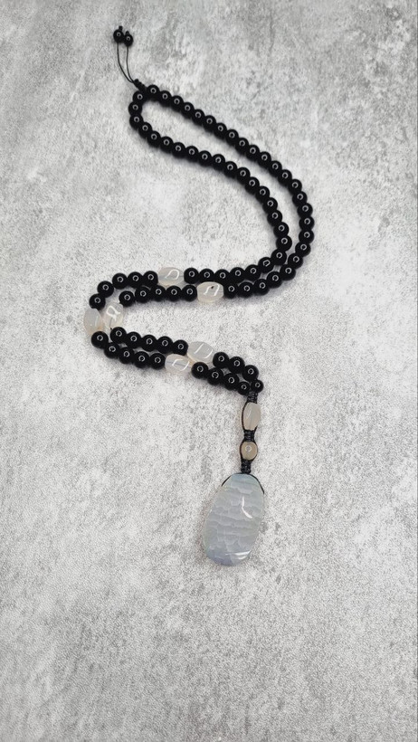🔹 گردنبند: ساختهشده با مهرههای اونیکس براق و عقیق سفید حلیپیچ، بههمراه آویز اسلایس عقیق طبیعی که زیبایی ساده و خالصی داره