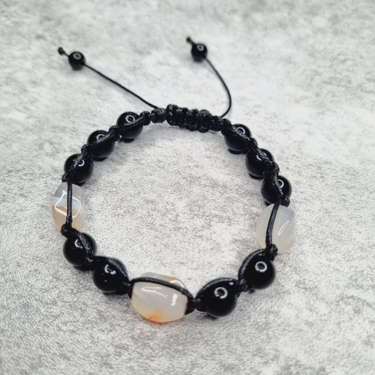 🔹 دستبند: بافت چرمی مشکی با گره آسانسوری، دارای ۳ مهره عقیق سفید در وسط و اونیکس براق در اطراف – قابل تنظیم برای انواع مچ