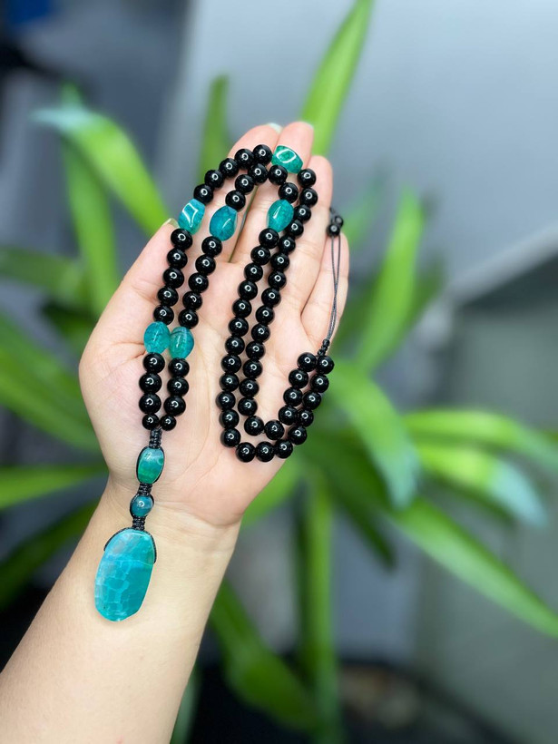 ترکیب عقیق سبز حلیپیچ و اونیکس براق مشکی با آویز اسلایس عقیق