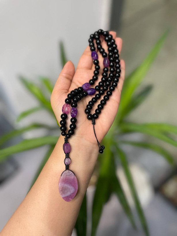 این گردنبند مناسب لحظاتیست که به انگیزه، وضوح فکری و روشنایی درونی نیاز داری. ترکیب پرانرژی عقیق بنفش با سنگ محافظ اونیکس براق، تو رو به شعلهی آگاهانهی عنصر آتش متصل میکنه؛ شعلهای که میسوزونه، اما برای تحول، نه برای نابودی.