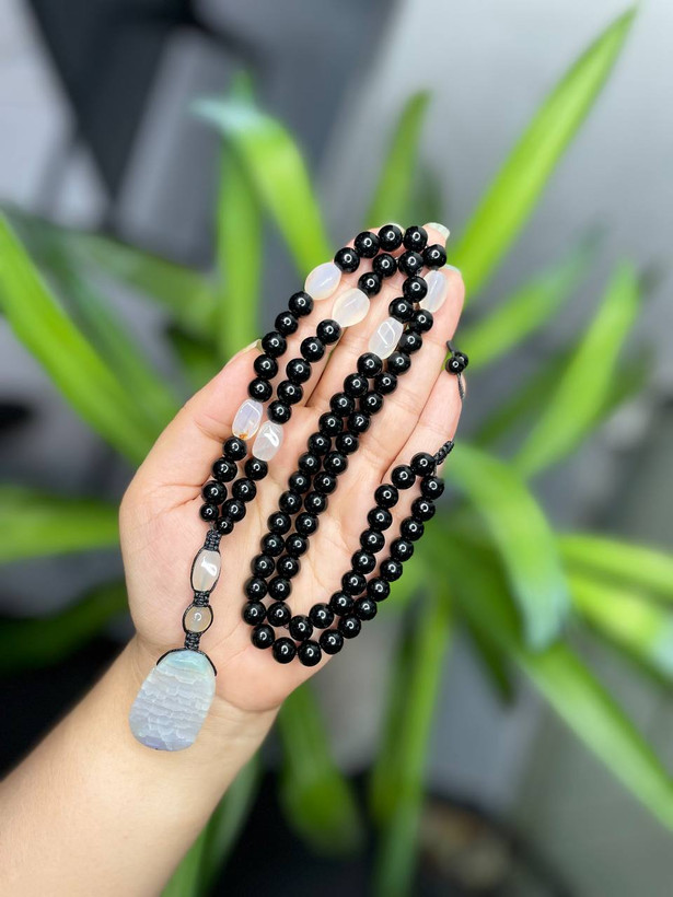 ترکیب عقیق سفید حلیپیچ و اونیکس براق مشکی با آویز اسلایس عقیق