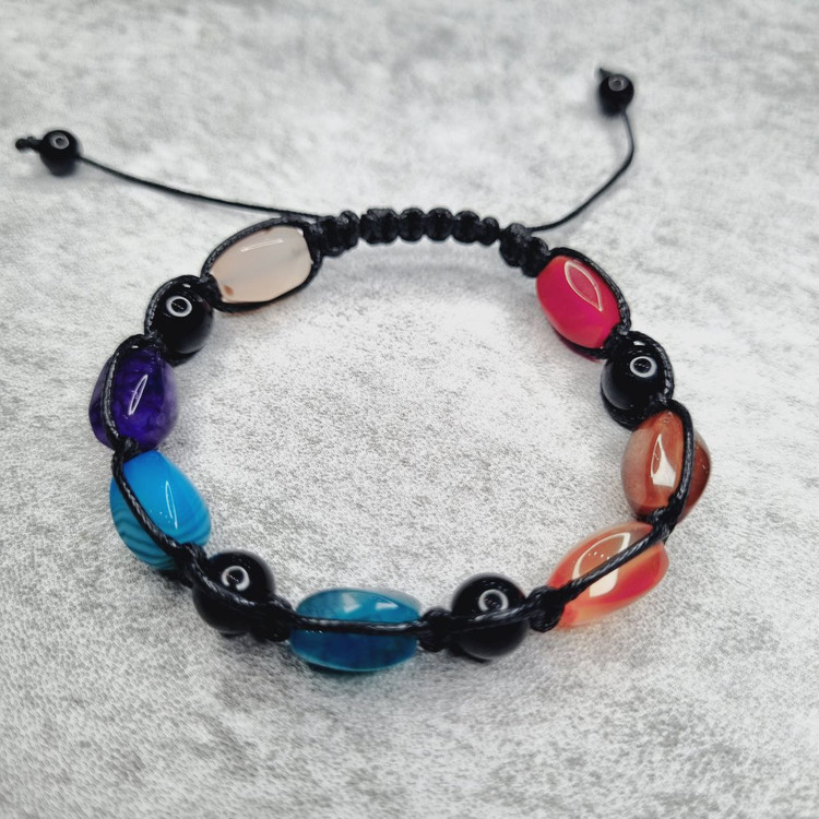 ترکیب هفت مهره عقیق حلیپیچ رنگی، بافتهشده با نخ چرمی مشکی