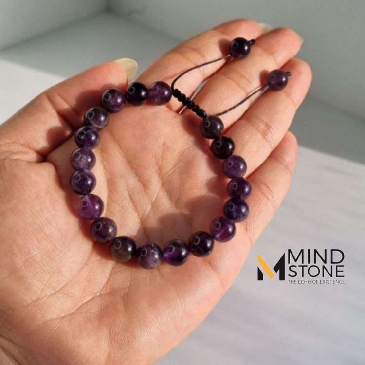 این دستبند از مهرههای سنگ طبیعی آمیتیست با سایز ۸ میلیمتر ساخته شده و با نخ دندلیون محکم و بافت آسانسوری قابل تنظیم طراحی شده تا هم راحت باشه و هم برای همه سایز مچها مناسب.