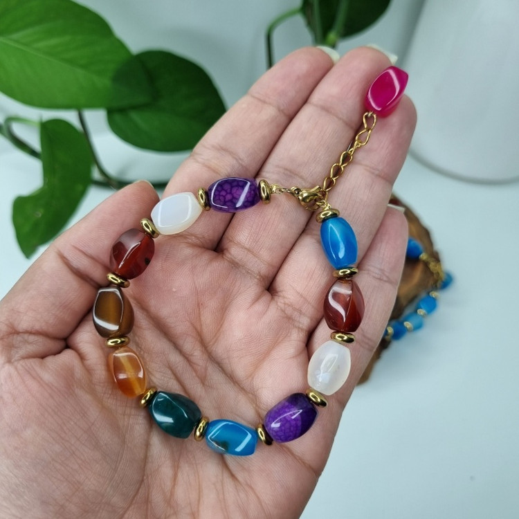 این دستبند چشمنواز با سنگهای عقیق پیچ در رنگهای شاد و متنوع طراحی شده و ظاهر آن حس طراوت و شادی را منتقل میکند. مغزی اصلی کار از سیم بکسل ۰.۵ میلیمتر ساخته شده که هم مقاوم است و هم انعطافپذیر.