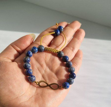 دستبند سنگی لاجورد با پلاک بینهایت – نماد پیوستگی و آرامش